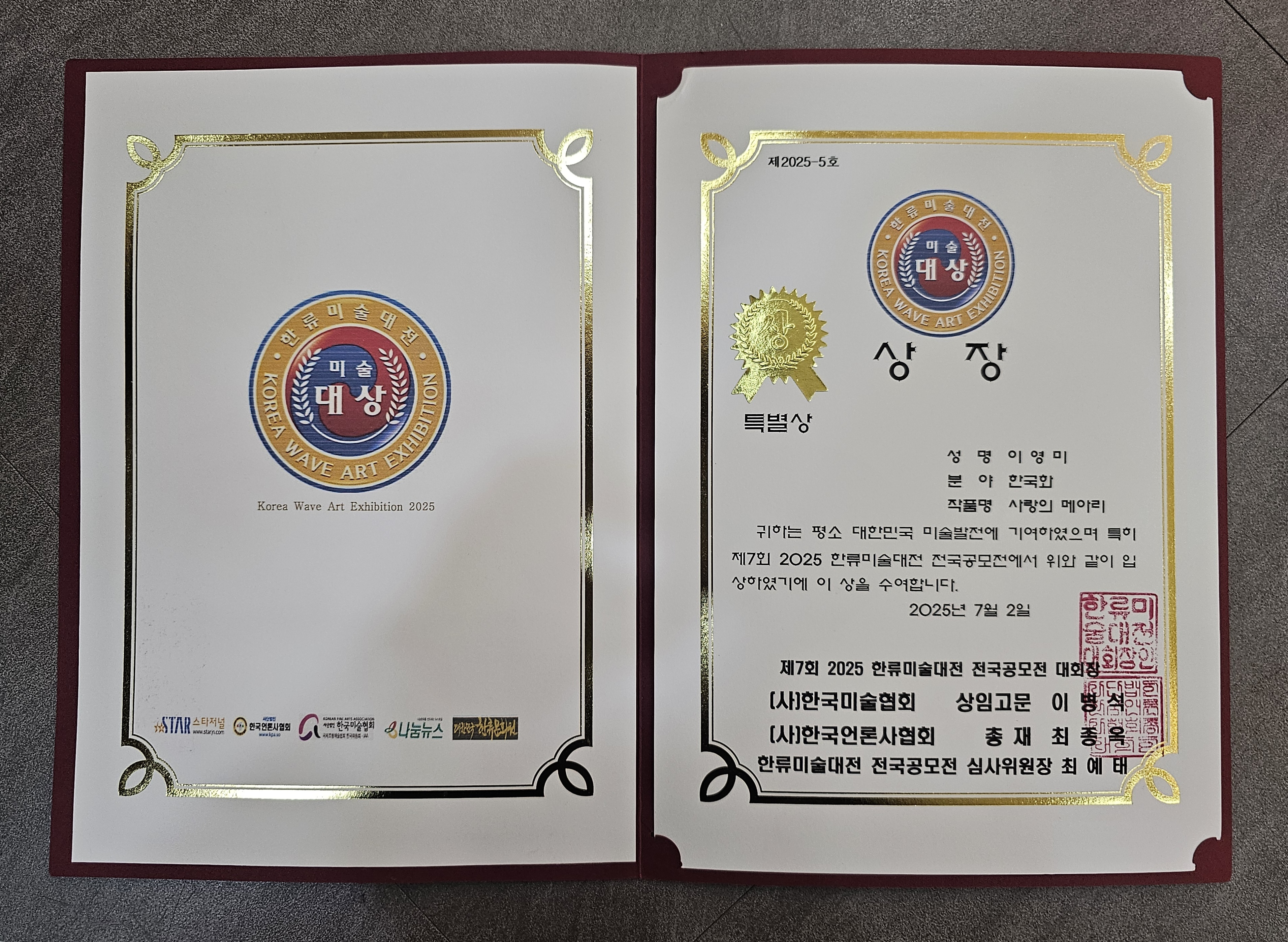 7¿ù 2ÀÏ ÀÎ»ç¾ÆÆ®ÇÁ¶óÀÚ°¶·¯¸® 1Ãþ ±×·£µå°ü¿¡¼ ¿¸° Á¦7ȸ ÇÑ·ù¹Ì¼ú´ëÀü, Á¦6ȸ ÇÑ·ù¹®È¿ø Ưº°ÃÊ´ëÀü ½Ã»ó½Ä¿¡¼ ¿ÌÄ¥È "»ç¶ûÀÇ ¿¡¾Æ¸®" ÀÛǰÀ¸·Î ÇÑ·ù¹Ì¼ú´ëÀü Ưº°»óÀ» ¼ö»óÇÏ¿´´Ù. ¶ÇÇÑ 8¿ù 1ÀϺÎÅÍ 31ÀϱîÁö ¼º³² µ¥ÀÏÀÌ ¾ÆÆ® ½ºÆäÀ̽º¡®¿ìÁÖ¿ÍÀÇ ¼ÒÅë2025 °ö½½LeeÀÇ ¿Ì, ºû ArtÀü½Ãȸ¸¦ °¡Á³´Ù.