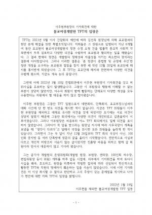 2021 6. 9 ¿ÀÈÄ 2½Ã ºÒ±³¿©¼º°³¹ß¿ø À̻簣´ãȸ¿¡¼ Æ÷±³¿ø Çö¾È ÇØ°áÀ» À§ÇÑ TFT(ÀÌÈÄ ºñ´ëÀ§_ ºñ»ó´ëÃ¥À§¿øÈ¸) ¹ßÁ·ÇÏ°í ±× ÀÏ¿øÀÎ ÀÌÁÖÇö ºÎ¿øÀåÀÌ 2022.1.18(È) ¿ÀÈÄ 4½Ã 30ºÐ¿¡±âÀÚȸ°ßÀ» ÀÚûÇÑ ³»¿ë¿¡ ´ëÇØ ºñ´ëÀ§ÀÇ ÀÔÀå¹®À» ¿Ã¸³´Ï´Ù.